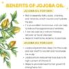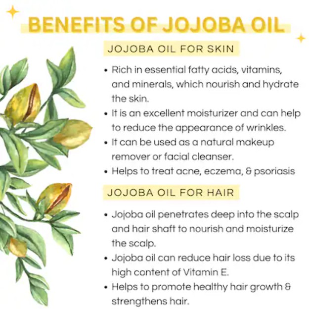 Jojoba oil is a natural humectant, meaning it draws moisture into the skin and retains it, making it an excellent moisturizer for all skin types.Balances Sebum Production:Jojoba oil mimics the skin’s natural sebum, helping to regulate oil production and prevent clogged pores, which can be beneficial for acne-prone skin.Soothing and Anti-inflammatory:Its anti-inflammatory properties can help soothe irritated skin, reduce redness, and ease the effects of conditions like eczema and rosacea.Wound Healing:Jojoba oil can accelerate wound healing and help prevent bacterial infections due to its antimicrobial and antifungal properties.Sunburn Relief:The oil’s moisturizing and anti-inflammatory properties can soothe sunburns and help repair sun-damaged skin.Anti-aging:Rich in antioxidants, jojoba oil can help protect against environmental damage and the signs of aging, improving skin elasticity and reducing the appearance of fine lines and wrinkles.Makeup Removal:Jojoba oil can effectively and gently remove makeup, leaving skin feeling moisturized and clean.Non-comedogenic:Jojoba oil is non-comedogenic, meaning it won’t clog pores, making it suitable for all skin types, including those prone to acneNatural Emollient:Jojoba oil is a natural emollient, meaning it softens and smooths dry, flaky skin, helping to restore the skin’s natural barrier.Hair Benefits: