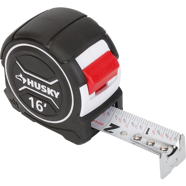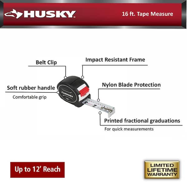 Husky 16FT Tape Measure with 1-1/8 in. W blade for added standout, can reach up to 12FT of reach, and its soft rubber cover can make gripping more comfortable. This tape measure also has Nylon blade protection for durability, and impact-resistant reinforced frame prolong the life. Printed fractional graduations on the tape blade for quick measurements, high contrast printing blade color allow for better readability in any situation.