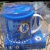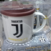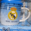 Ceramic mug with rubber lid and ceramic stirring spoon.