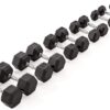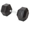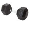 The Rubber Hex Dumbbell features durable rubber-covered heads for increased safety and comfort. The rubber coating increases durability, protects flooring and equipment, enhances appearance, diminishes noise, and is easy to clean. The heads are permanently affixed to a thick solid steel shaft improving the strength of the head / handle joint. The knurled chrome handles are ergonomically contoured to fit comfortably in the palm of the user. Rubber Hex dumbbells are a great addition to any workout space.