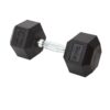 The Rubber Hex Dumbbell features durable rubber-covered heads for increased safety and comfort. The rubber coating increases durability, protects flooring and equipment, enhances appearance, diminishes noise, and is easy to clean. The heads are permanently affixed to a thick solid steel shaft improving the strength of the head / handle joint. The knurled chrome handles are ergonomically contoured to fit comfortably in the palm of the user. Rubber Hex dumbbells are a great addition to any workout space.
