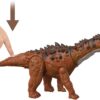 In Jurassic World, the Ampelosaurus is depicted as a large, herbivorous dinosaur with a long neck, bulky body, and a distinctive row of bony frills along its back, making it easily recognizable as a titanosaur; it is portrayed as a relatively peaceful creature, primarily focused on grazing, but capable of defending itself with its size and sharp claws if threatened, as seen in the “Jurassic World Dominion” movie where it is featured with a more active role.
