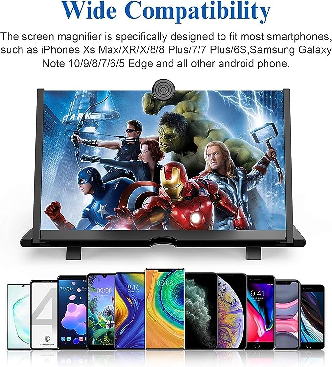 • [ Wide Compatibility ]- The screen magnifier compatible with all 4-8 inch smartphones, so whether you have an iPhone or an Android phone. Such as iPhones 14Pro Max/13/12Pro Max/12/12 mini / 11 pro max /11 / Xs Max/XR/X/8/8 Plus/7/7 Plus/6s Plus, Samsung Galaxy S10/Note10/9/8/7/6/5 Edge Android phone smartphones. And This screen magnifier projector screen is sure to work with your device.